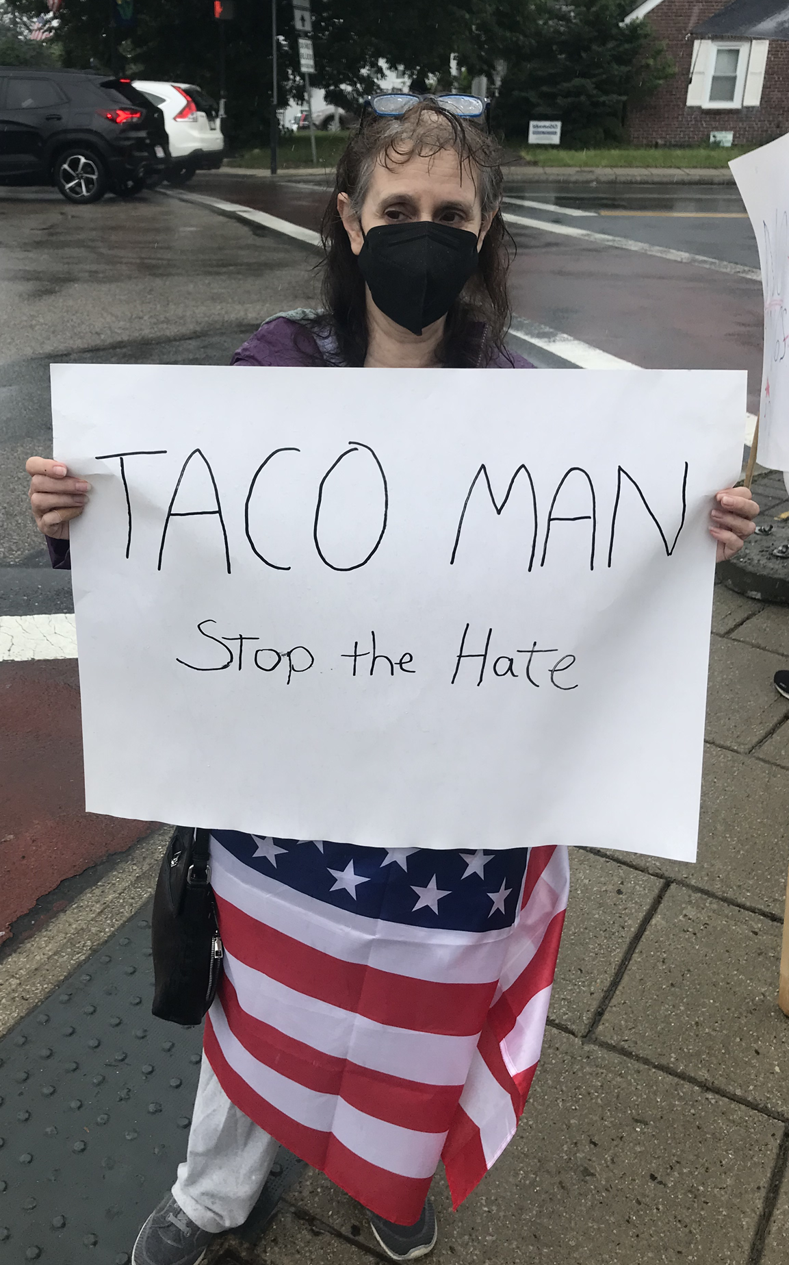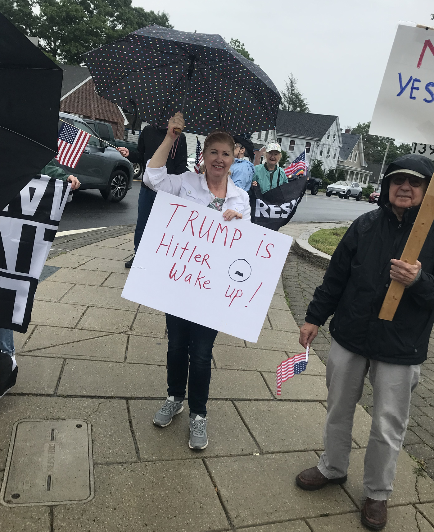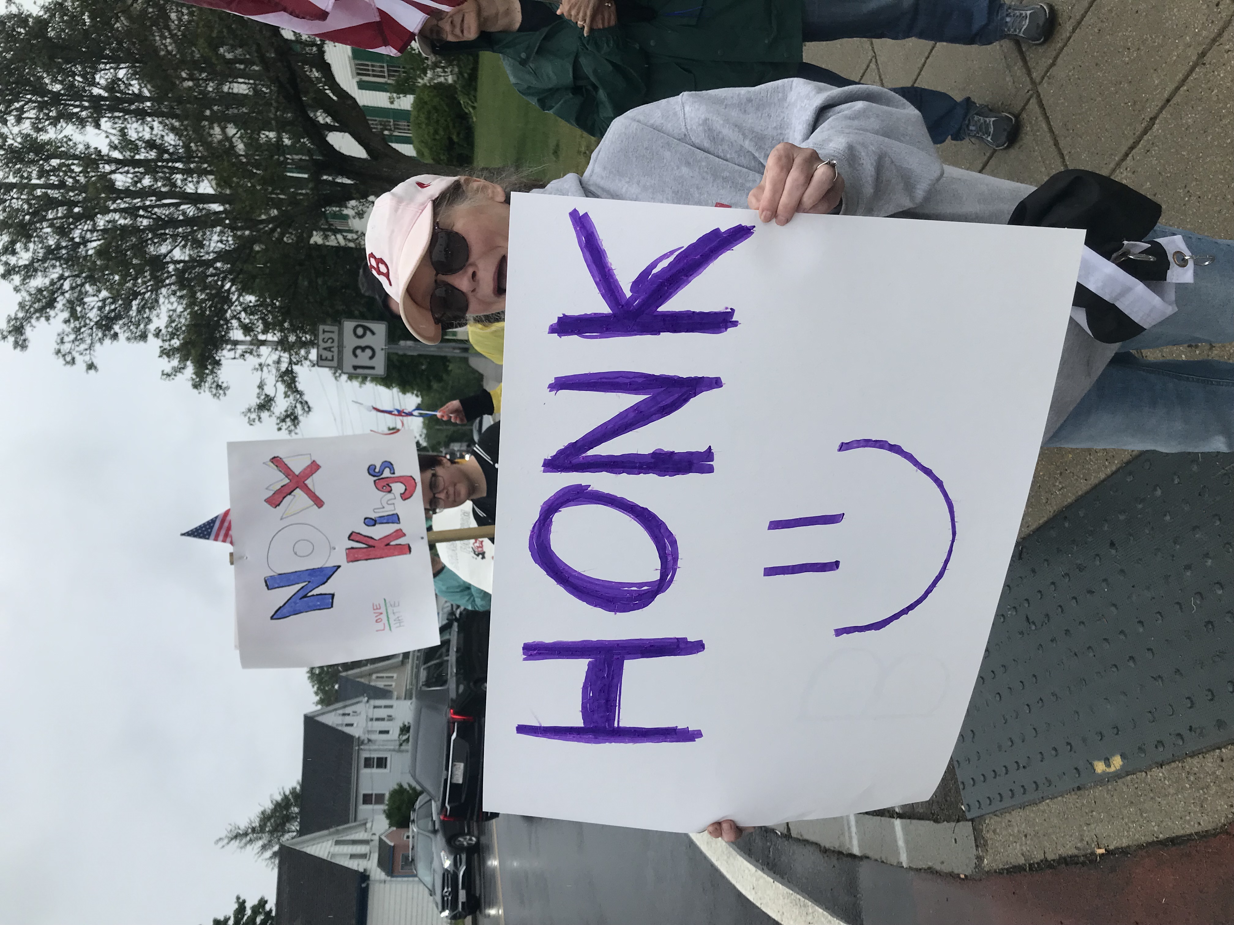 Below left is Kathleen Crogan-Camara making the connection, by moustache, of Trump and Hitler. "TACO" means "Trump Always Chickens Out", referring to Trump's common pattern of haphazardly rescinding orders. The upside-down flag is a symbol of "America in trouble." And honking is the way passing motorists communicated with us: more than 10-to-1 honked in favor (as opposed to yelled their disagreement).