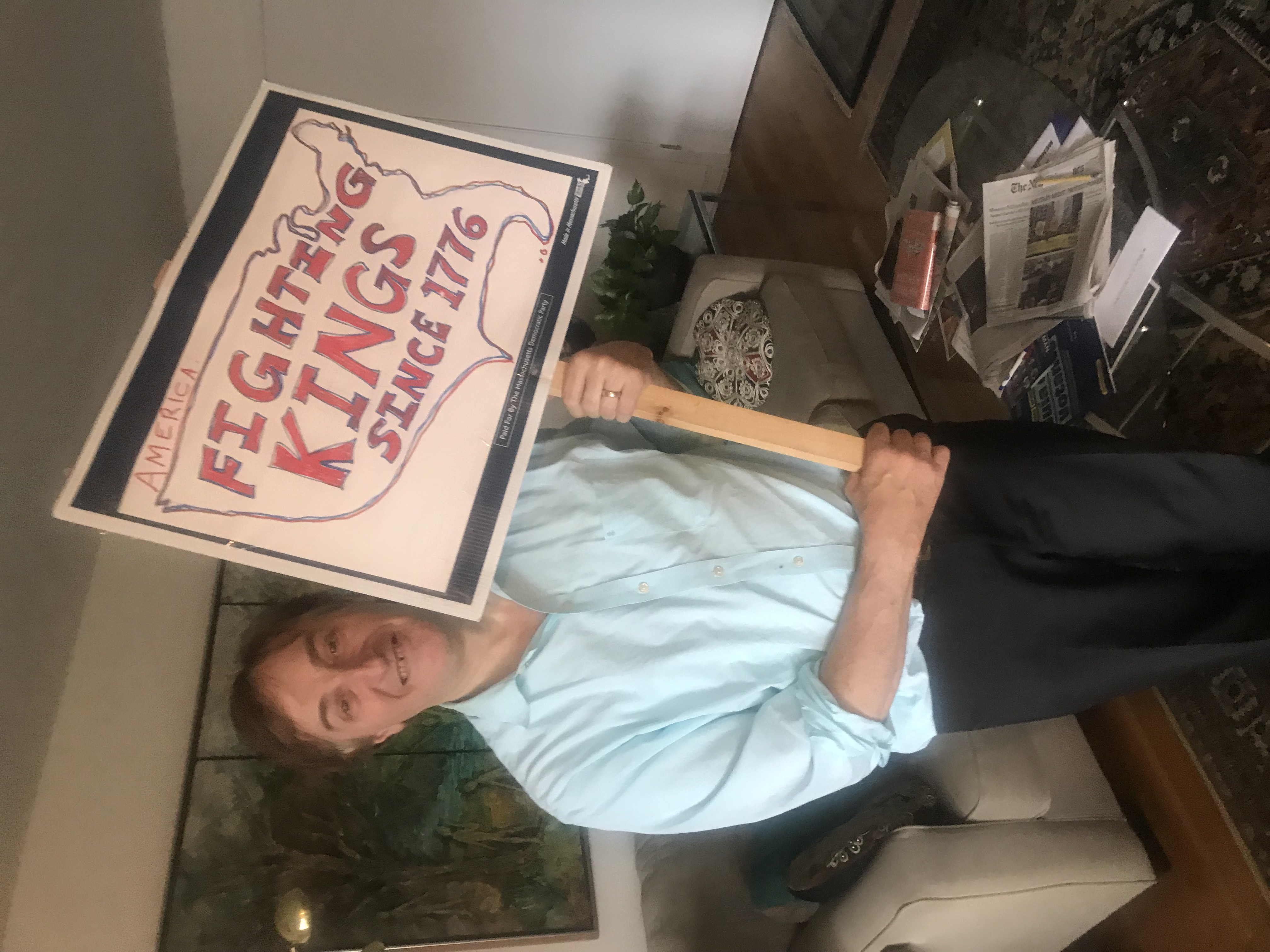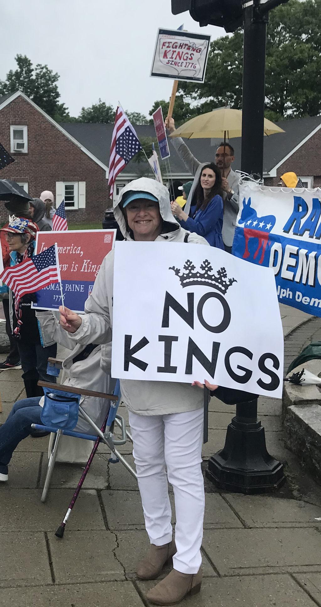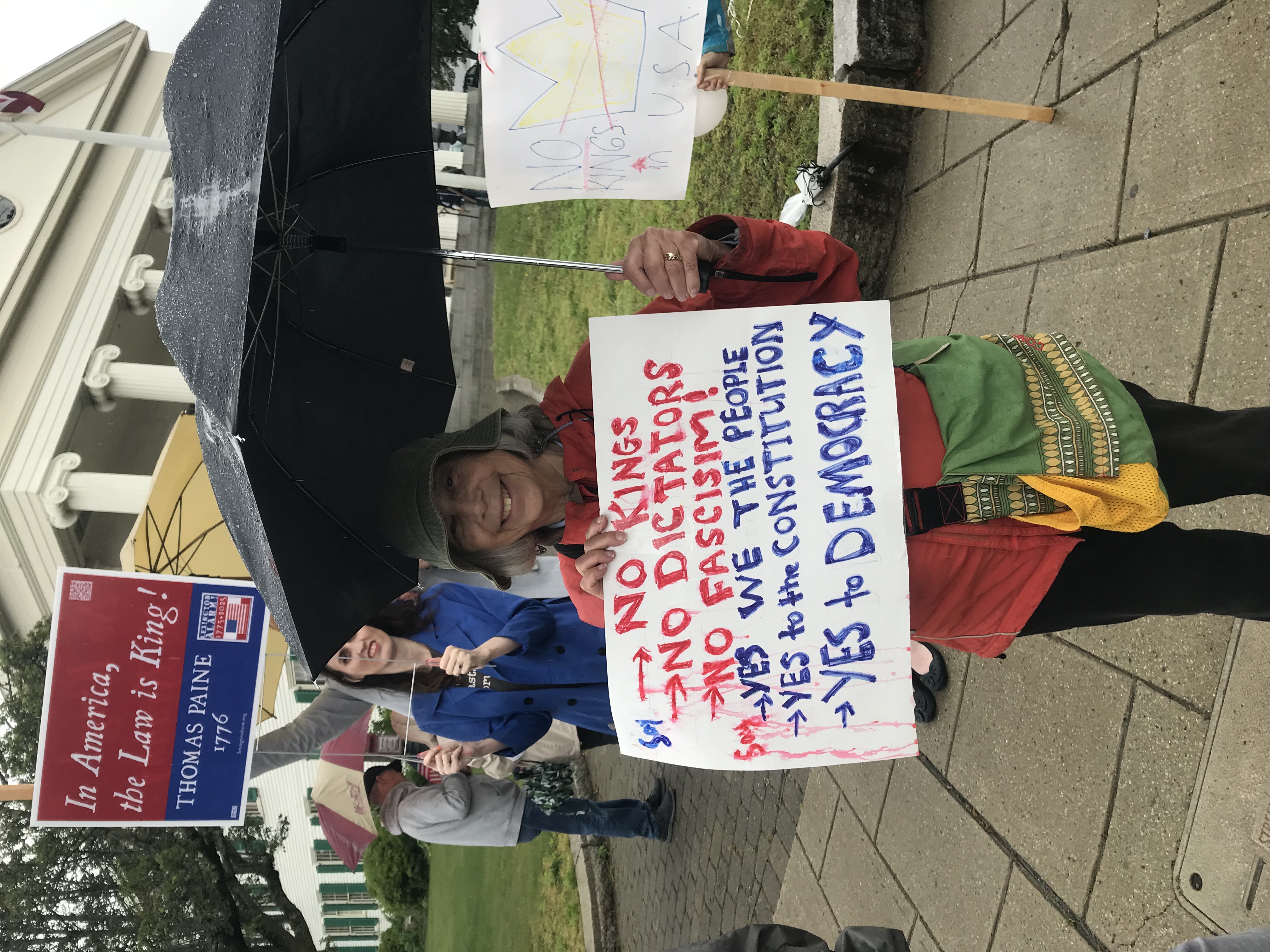 Over five million people attended over 2,000 rallies nationwide on June 14, including in Randolph. Some of them had nicely-printed signs, but I think the hand-made signs say a lot more. My sign, to the right, says "America: Fighting Kings Since 1776". Here's a sample from Stetson Hall in Crawford Square...