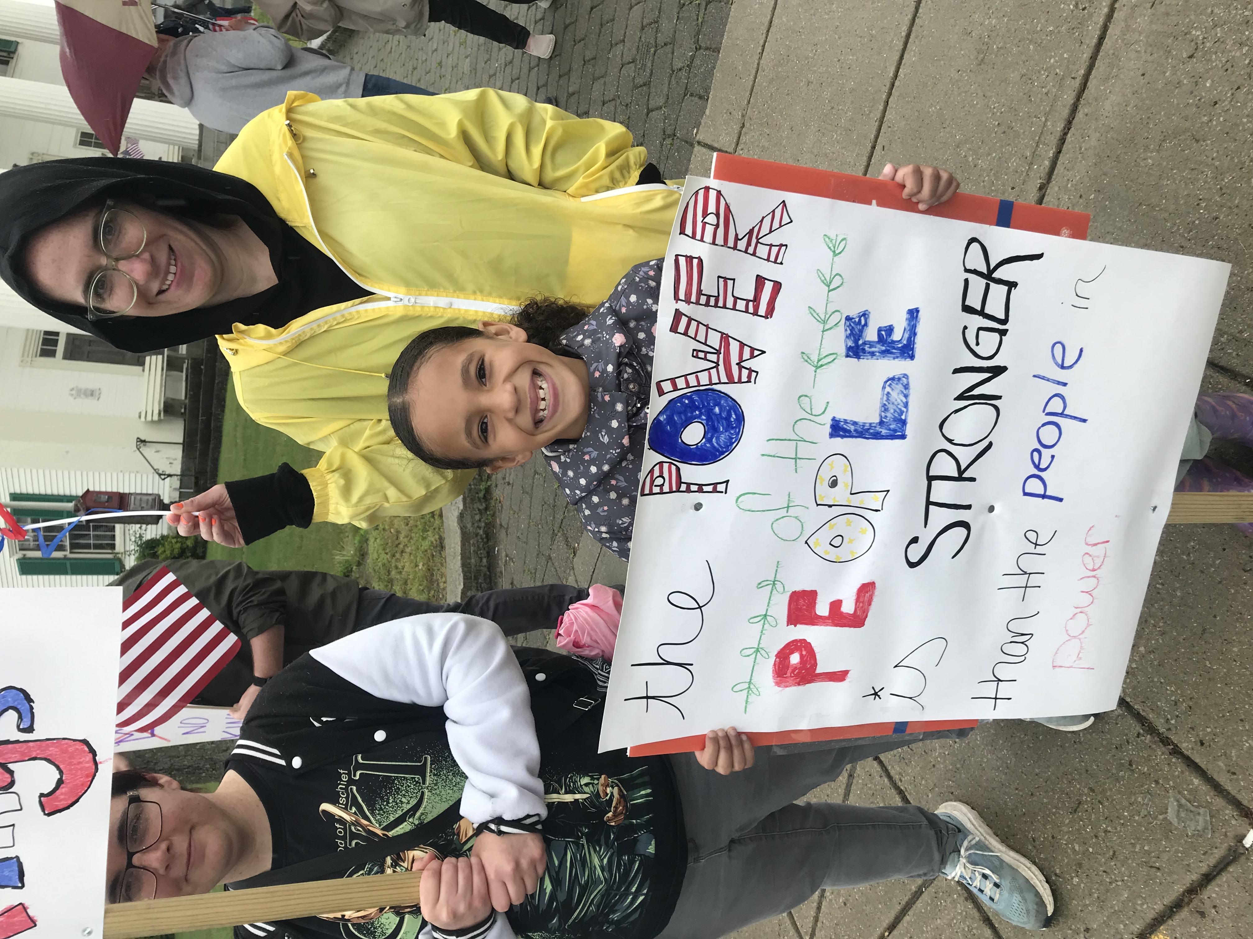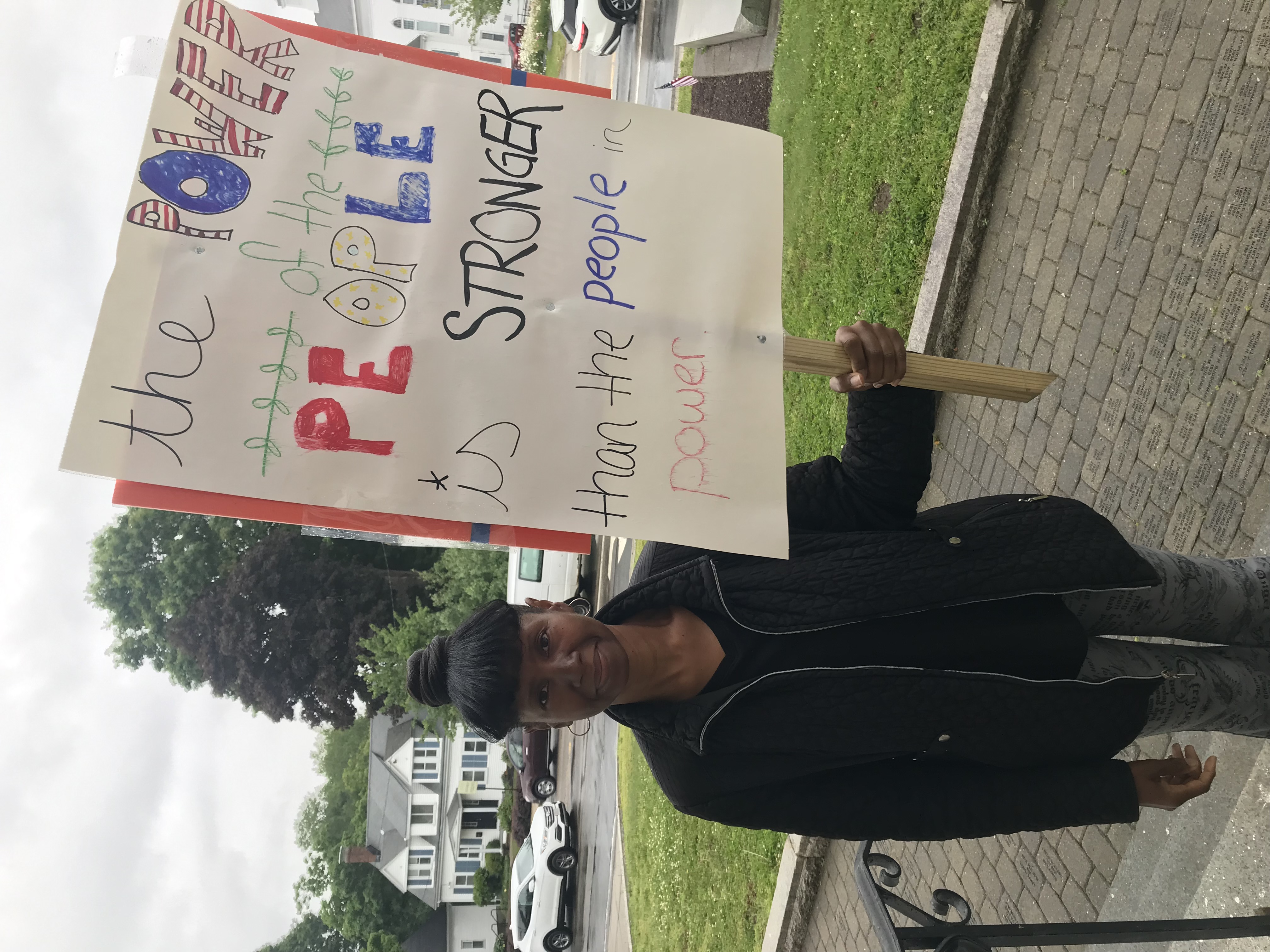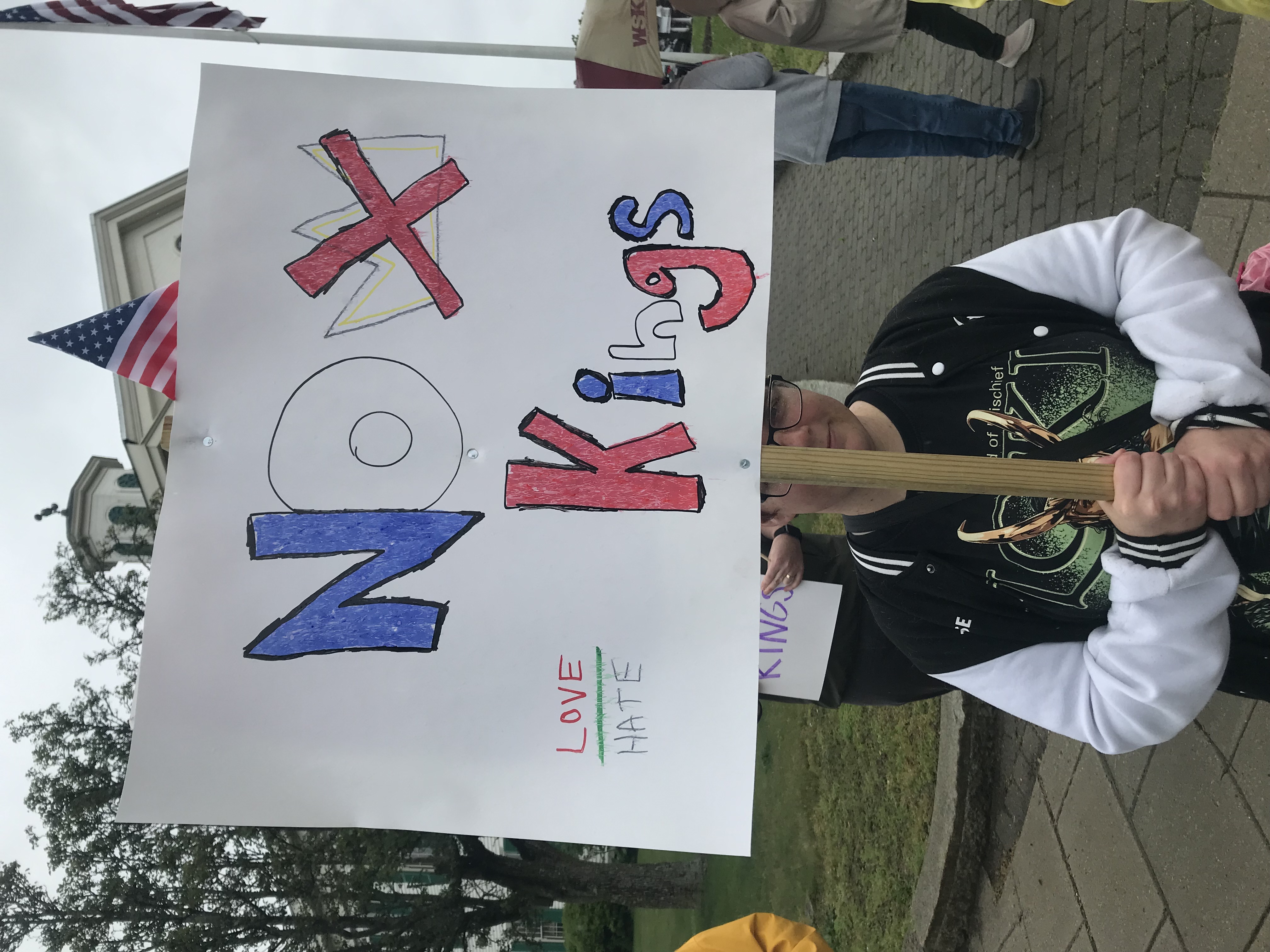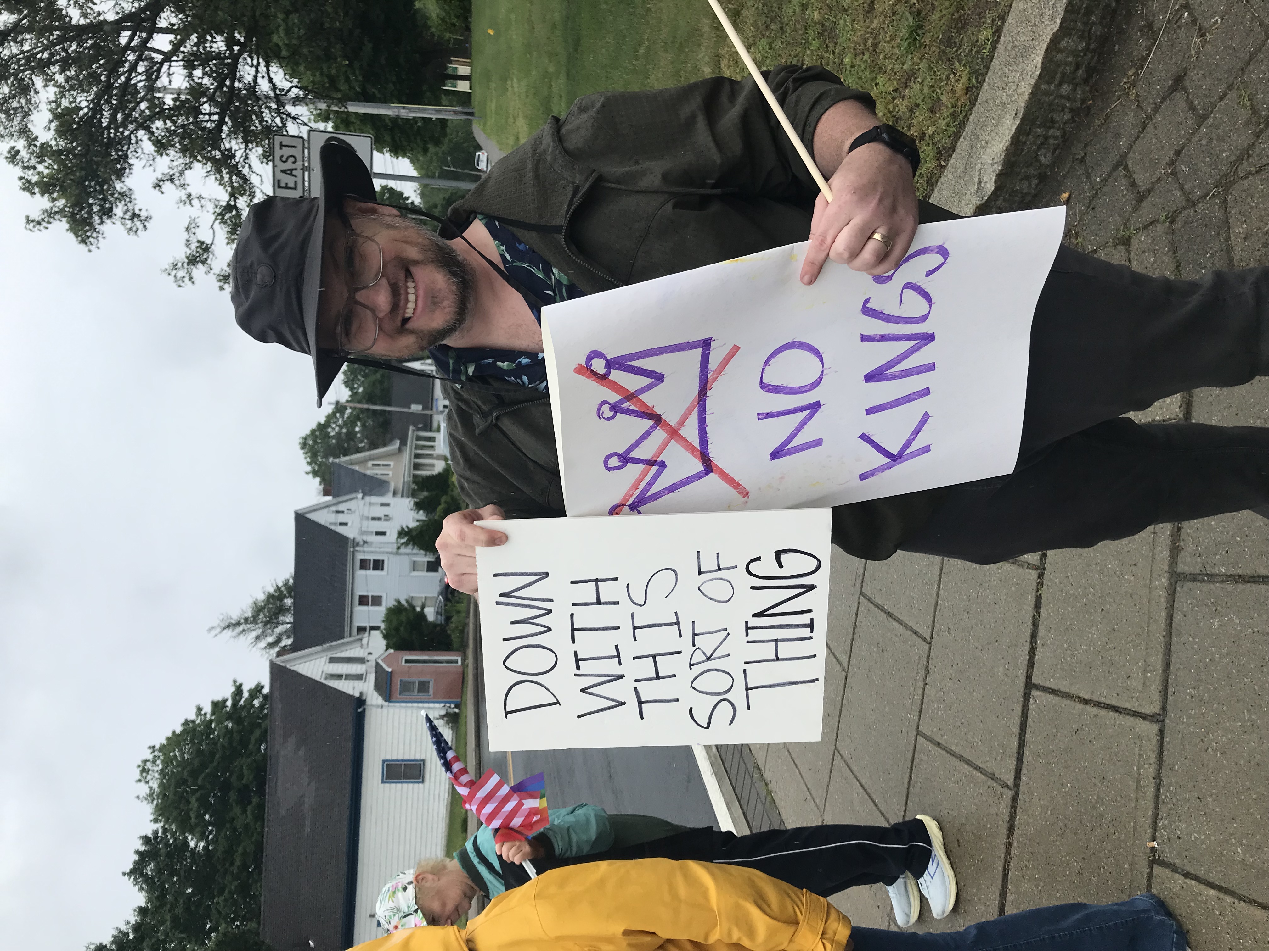 Over five million people attended over 2,000 rallies nationwide on June 14, including in Randolph. Some of them had nicely-printed signs, but I think the hand-made signs say a lot more. My sign, to the right, says "America: Fighting Kings Since 1776". Here's a sample from Stetson Hall in Crawford Square...